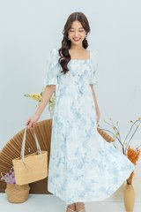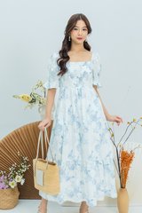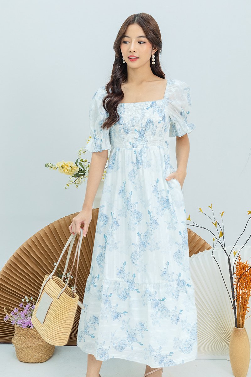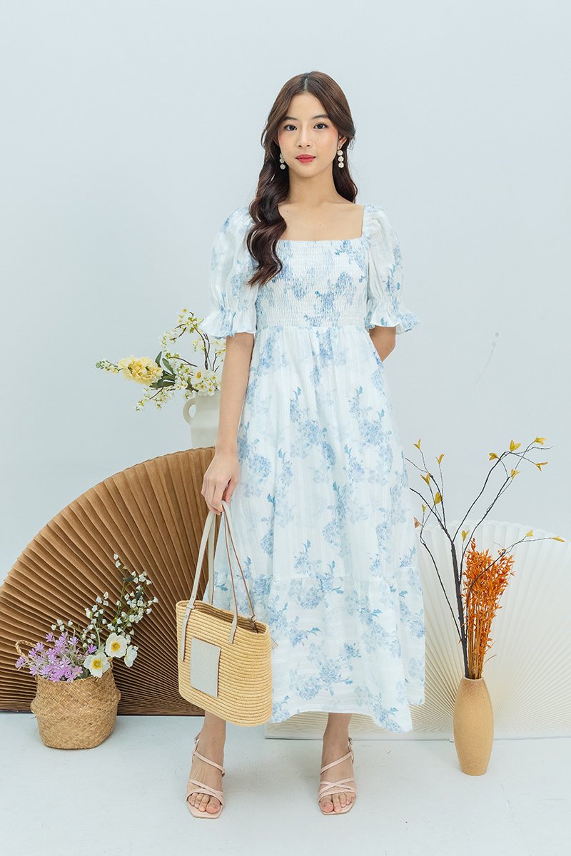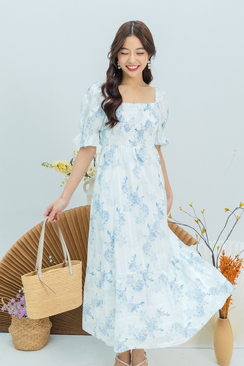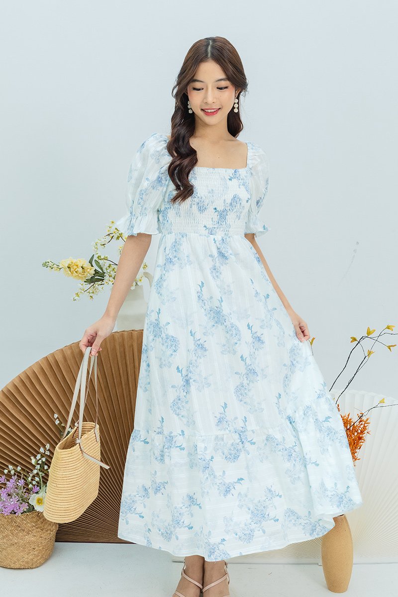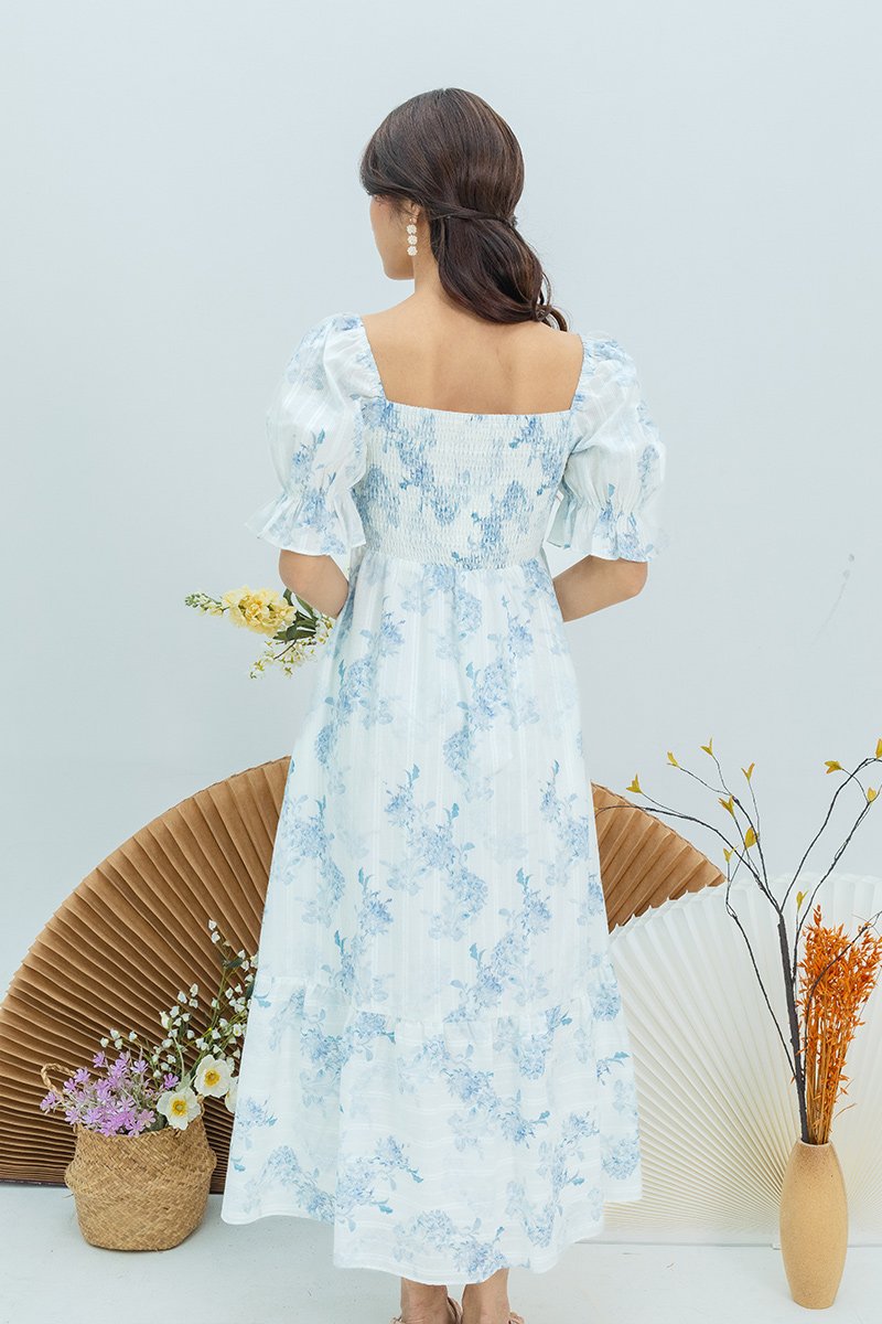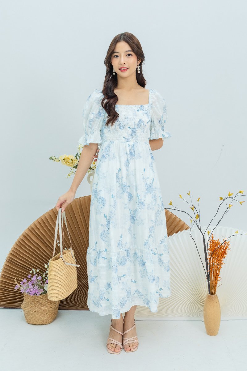 Amelie Smocked Puffy Sleeves Dress in Celestia Blue Florals