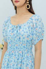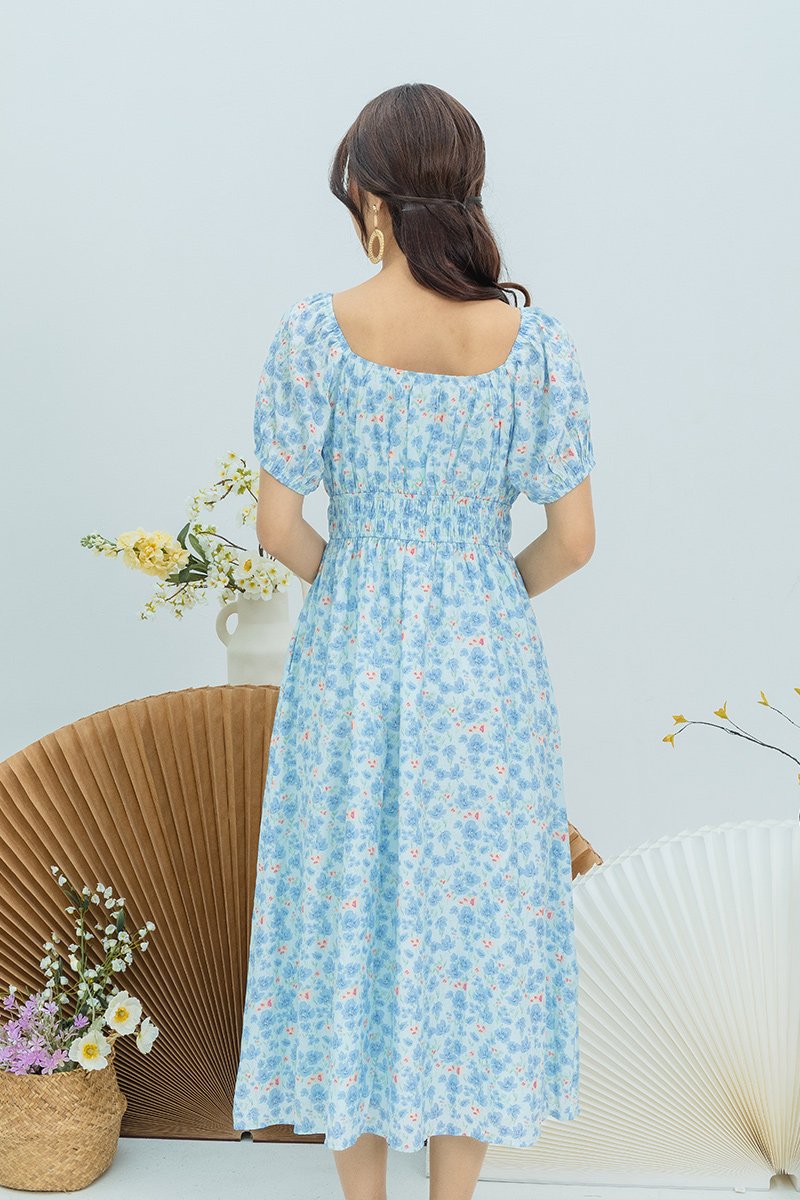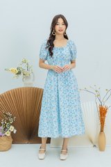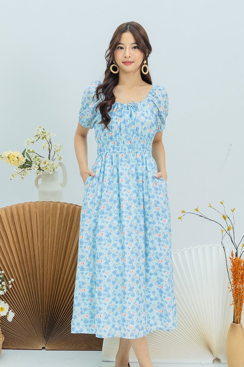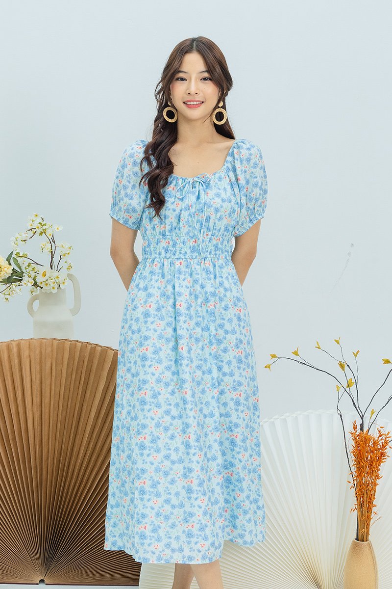 Featuring a drawstring neckline with a subtle keyhole opening, puff sleeves, and a smocked waist for comfort, the flowy silhouette moves beautifully with every step. A charming piece that feels both modern and timeless.