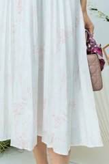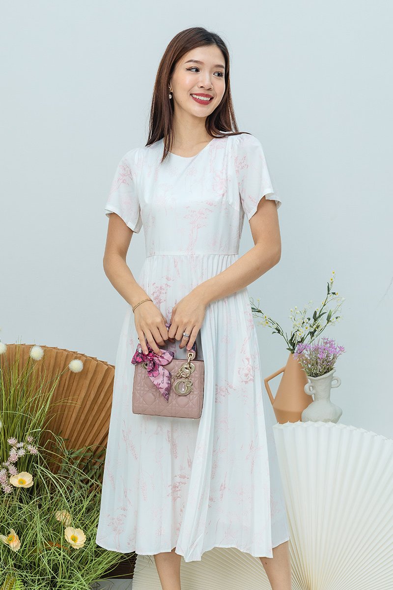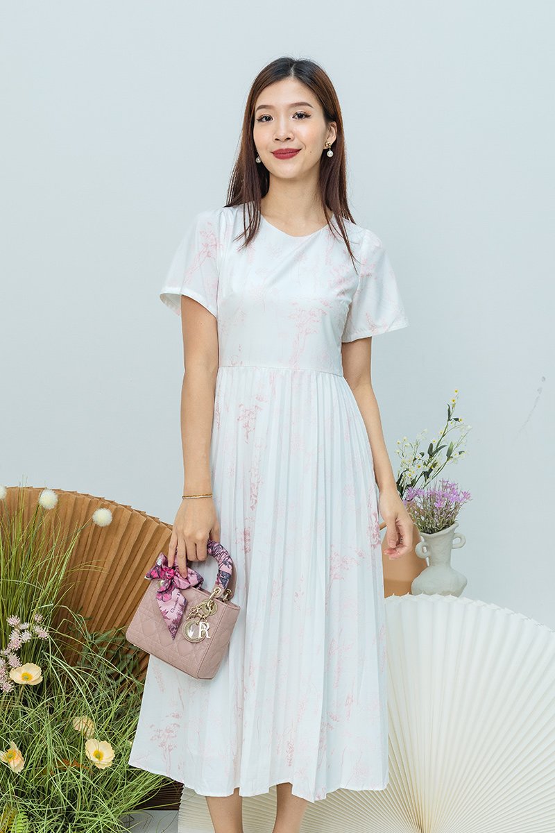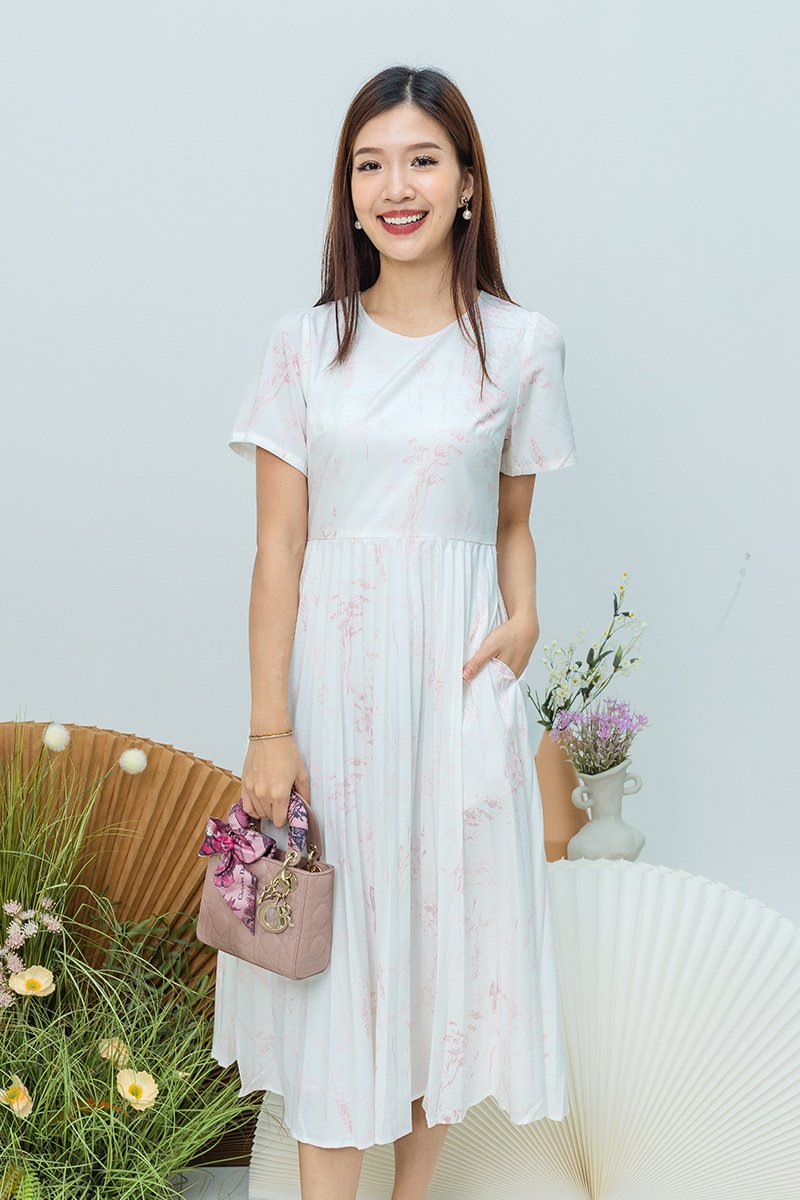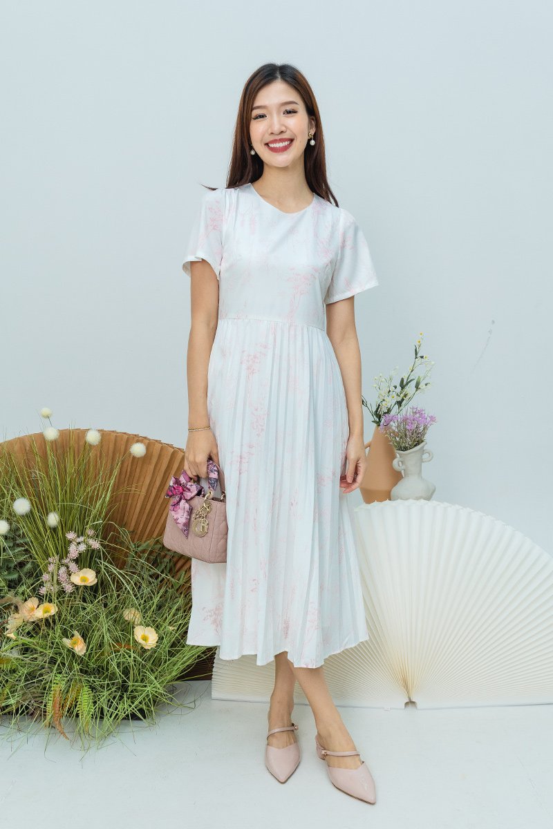 The Gentle Folds Dress features a clean round neckline, short sleeves, and a softly pleated bottom that flows effortlessly with each step.