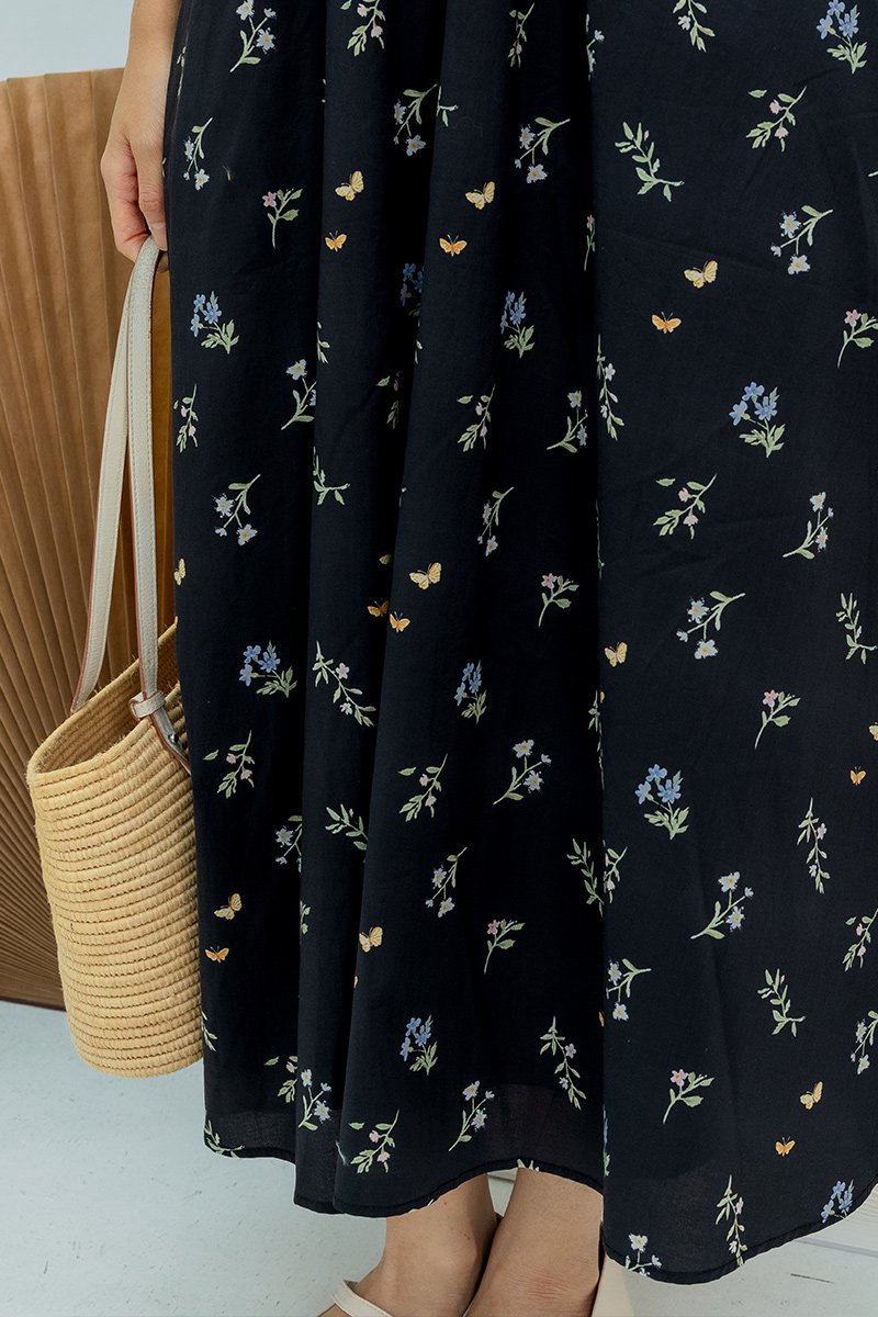 Crafted in a flattering, easy-to-wear silhouette, this dress features a dainty botanical and butterfly print that stands out beautifully against both its cream or black base.