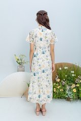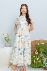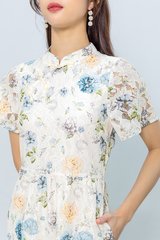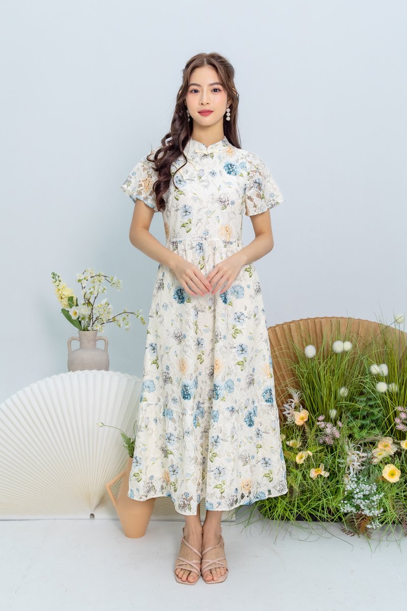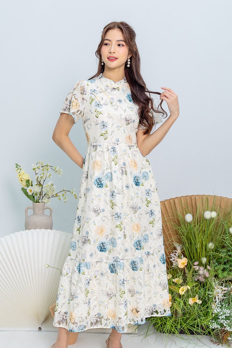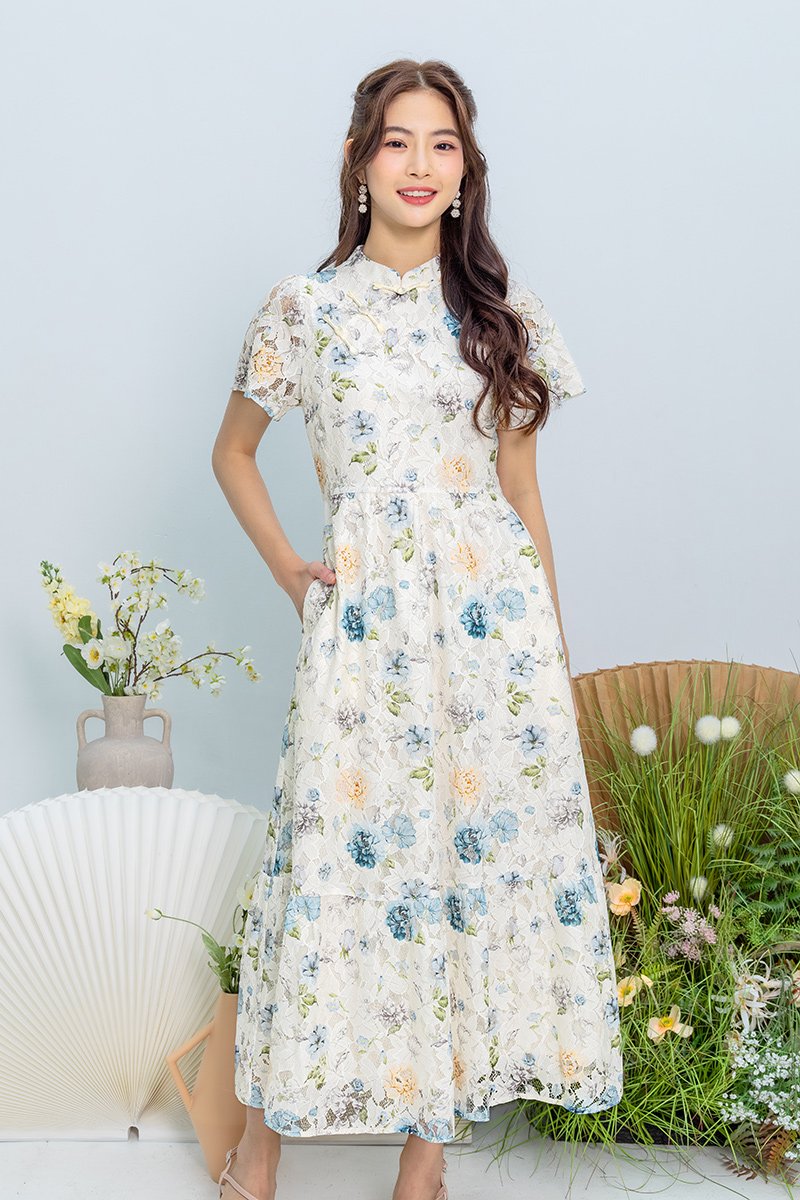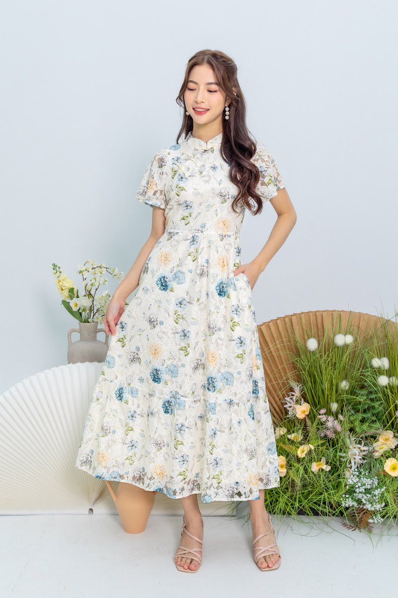 Soft Poise Lace Cheongsam Dress in Blue Peach